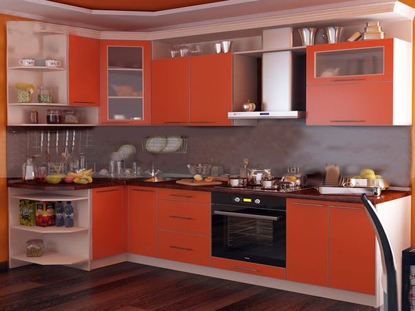 Такое решение для кухни будет выглядеть смело и красиво! Глянцевые кухни заставляют хозяек чувствовать себя изящными королевами подиума рядом с ними и готовить не менее грациозные блюда. Как правило, для выполнения глянцевых кухонь выбирают акриловый пластик, он-то и придает роскошь и элегантность. Помимо наглядных преимуществ, материал этот достаточно практичен. Такая кухня со временем не потеряет свой идеальный внешний вид.