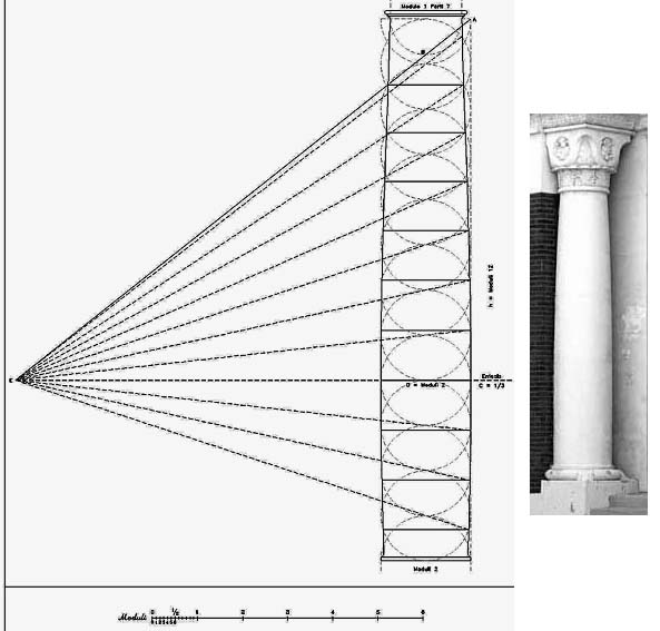 Построение энтазиса. Имеется колонна радиусом (модулем) нижнего основания 360мм. Модуль тосканского и дорического ордеров равняется 12 партам (парта равна 30мм), а модуль ионического и коринфского ордеров — 18 партам (парта составляет 20мм). Нижний диаметр для всех ордеров равен двум модулям. Колонны тосканского и дорического ордеров имеют высоту 14 и 16 модулей. Верхний диаметр Равен 1 модулю 8 партам, утонение на всю длину колонны — 120мм, на радиус или на половину колонны — 60мм.
