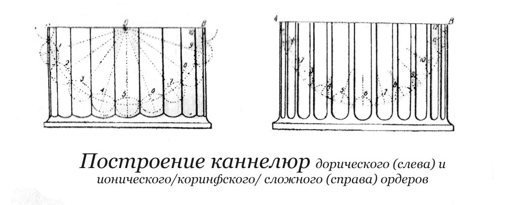 Каннелюры примыкают друг к другу острыми кромками (дорический ордер) или через плоскую перемычку (дорожку) – в сложных ордерах.