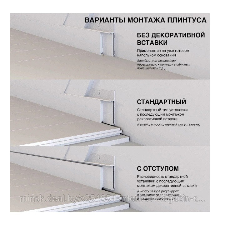 - Высокий. Предназначен для визуального разграничения пространства комнаты. Подбирается под оттенок напольного покрытия, либо межкомнатных дверей, монтируется на кронштейны. Средняя высота составляет в пределах 90 – 120 мм. Внутри конструкции имеются кабель-каналы для прокладки силовых проводов в изоляции.