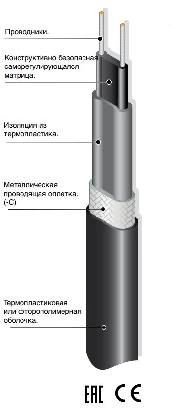 Саморегулирующийся греющий кабель нагревается до температуры в зависимости от его исполнения и вне зависимости от его мощности: