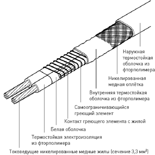 Схема секционно-резистивного нагревательного кабеля «RIM»Саморегулирующий греющий кабель для водопровода