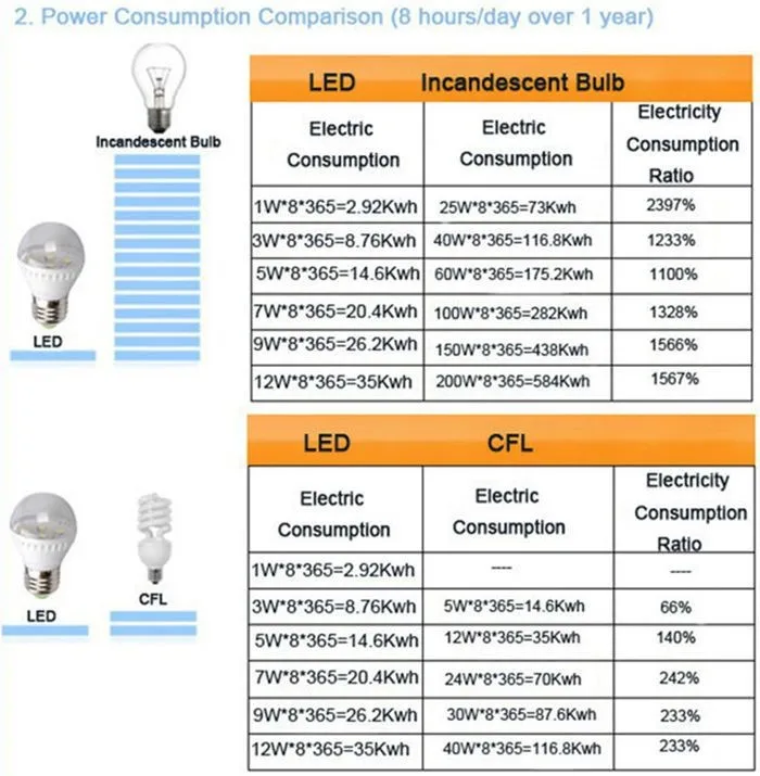 Источник света этих ламп – светодиоды. Главный плюс – это низкое энергопотребление, которое никак не влияет на яркость света. Можно сравнить данную модель с лампой накаливания. Используя LED-лампу (9 ватт), можно существенно сэкономить, купив лампу накаливания на 60 ватт, причем, энергии израсходывается в восемь раз меньше.