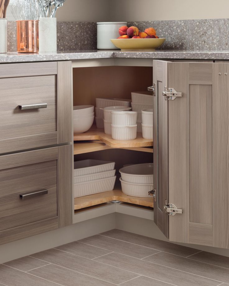 Они часто используют все угловое пространство, но, как и в случае с глухими угловыми шкафами, вам придется залезать в ниши шкафа, чтобы найти свою посуду.