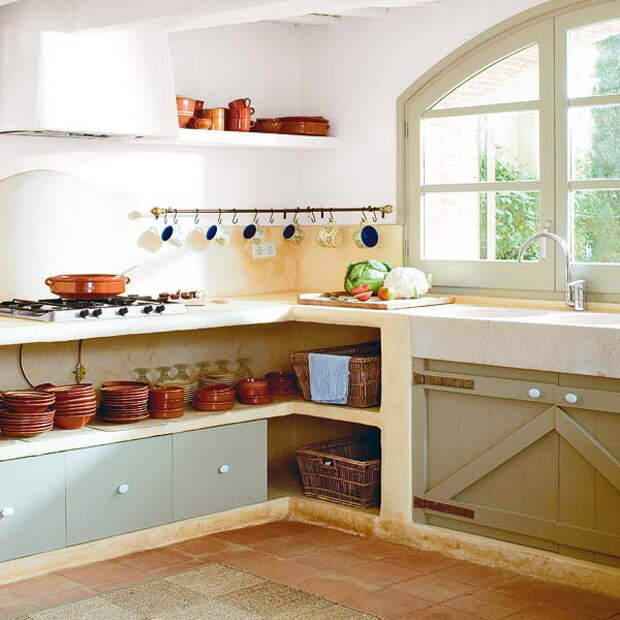 В качестве навесных шкафов можно использовать открытые навесные полки. Такое решение придаст кухне пасторальную атмосферу.