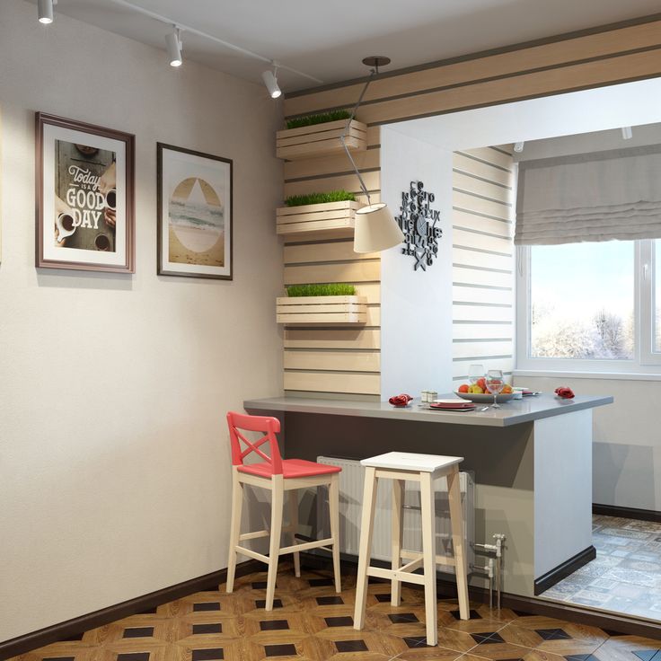 Барная стойка вместо обеденного стола, сэкономит место на маленькой кухнеЕще один способ — обустройство стола с помощью раскладной доски, прикрепленной к широкому подоконнику.