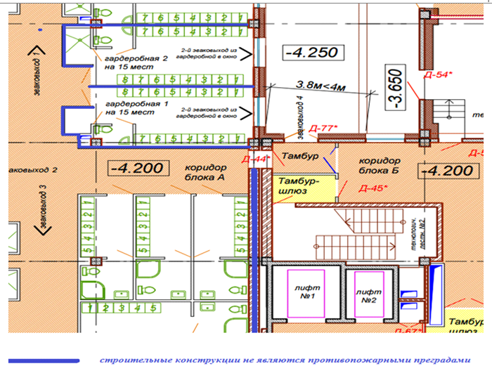 Внутренняя отделка (только стены и потолки): Для выходов и коридоров требуется класс «А». Все остальные не ниже класса «С» (10-3.3.1).