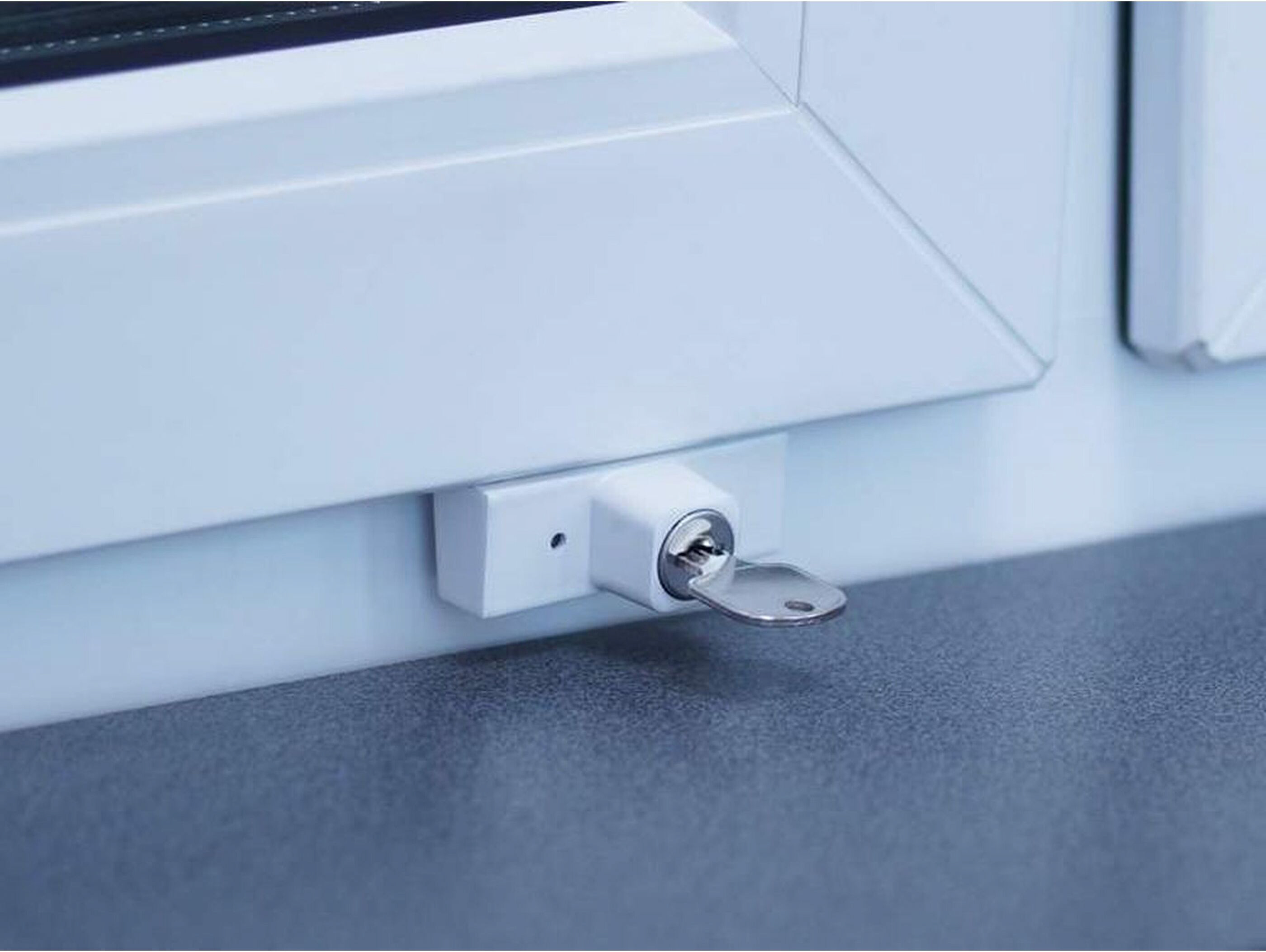 Замок-ограничитель поворота с ключом. Данное устройство устанавливается в нижней части на рабочей сворке окна, ответная часть замка крепиться к оконной раме.