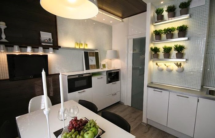 Узнать куда следует повесить телевизор в маленькой кухне можно посмотрев на фото.