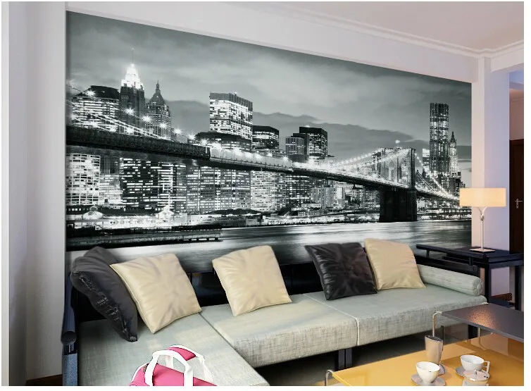 Хорошо смотрятся обои с городами в гостиной с черно-белой мебелью.