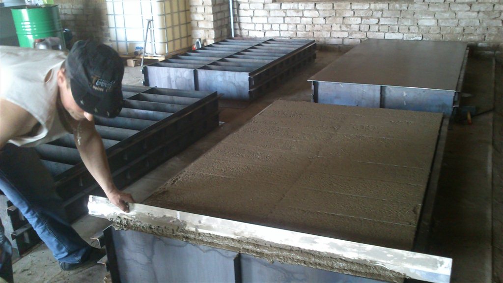 Важно, чтобы температура окружающей среды была выше +15°C. Только в этом случае можно будет гарантировать высокое качество всех протекающих процессов. - Внутрь приспособления устанавливаются образователи пустот. Пространство вокруг них заполняется готовой смесью. Слишком трамбовать не нужно, достаточно равномерно распределить ее по всей площади станка.