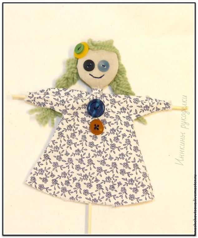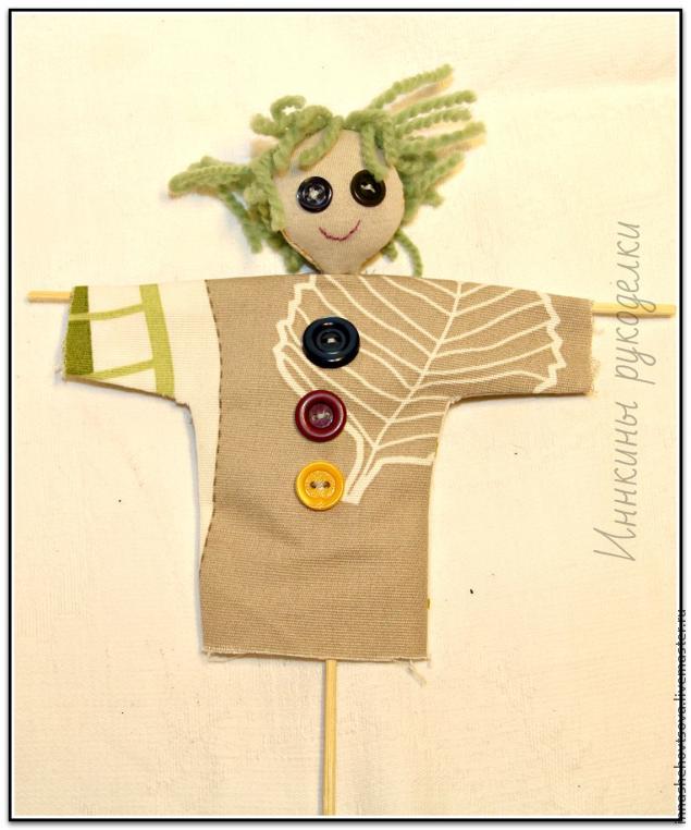 Длинную необрезанную шпажку тупым концом просовываем в голову. Она должна пройти между набивкой и тканью головы со стороны затылка. Снаружи на лицевой части ее не должно быть видно. Ура, получилось! Капаем на шпажку в районе шеи немного клея, прижимаем ткань шеи — и, вуаля! Голова прочно приделана к шпажке-позвоночнику!